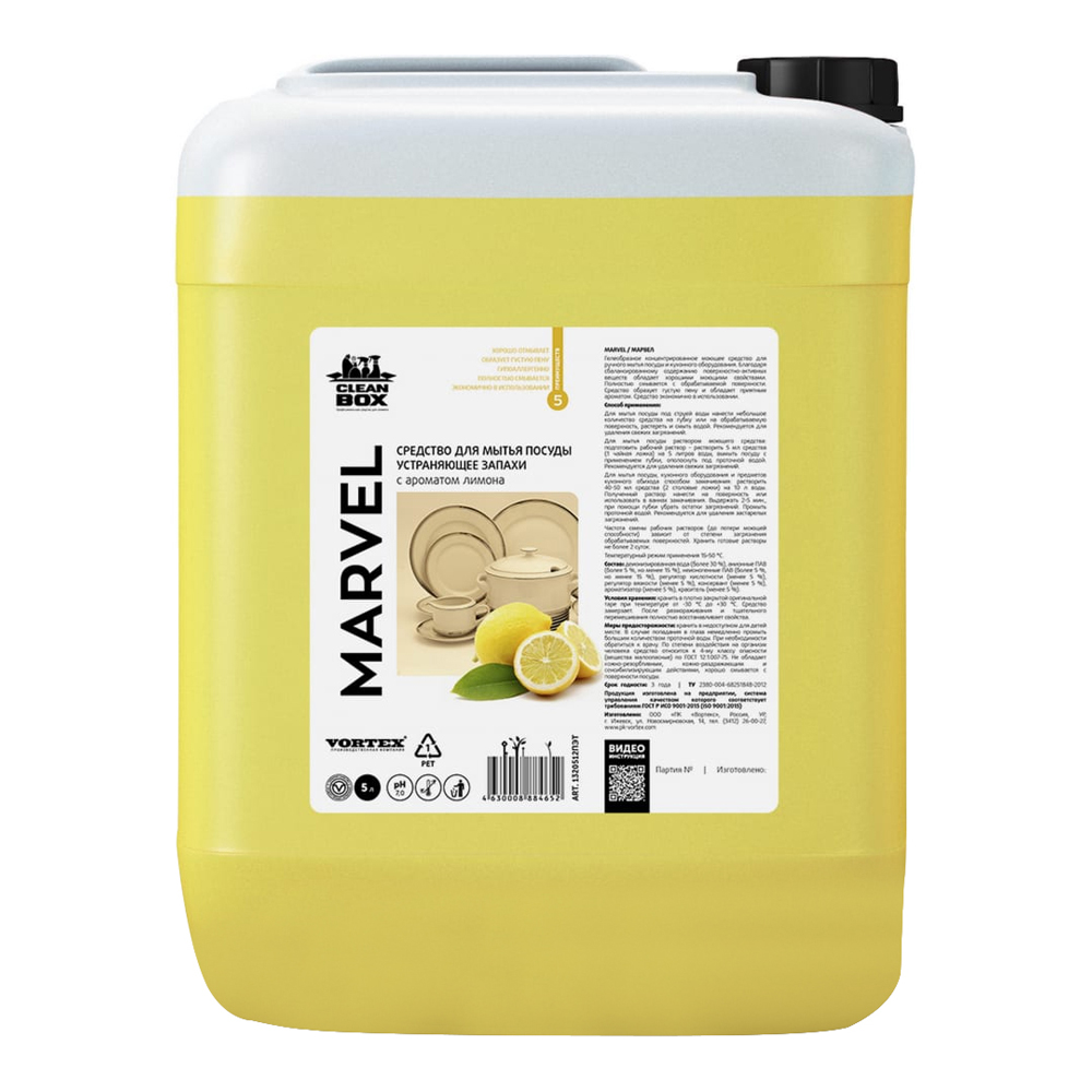 Средство для мытья посуды "Marvel" лимон 5л супер-концентрат — профессиональное моющее средство с концентрацией лимона обеспечит идеальную чистоту посуды в вашем заведении. Специальная формула позволяет эффективно удалять жир и остатки пищи даже в холодной воде, экономя время и ресурсы. Концентрированный состав уменьшает расход средства, делая его экономичным решением для заведений общественного питания в сегменте HoreCa. Подходит для ручного и автоматического мытья посуды. Создаёт обильную пену, оставляя после себя свежий цитрусовый аромат. Безопасно для кожи рук и экологично – полностью биоразлагаемо.